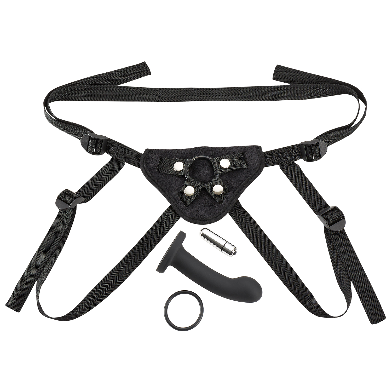 The cloud 9 pro sensual series strap on harness kit is perfect for those looking to expand their play with penetrative fun. This kit comes complete with a comfortable, adjustable harness featuring a durable, cushioned dildo pad covered in a velvety-soft material and sturdy nylon waist and thigh straps. Each kit also features a curved, 5.5" dildo with a rounded head that is the perfect shape and length to stimulate muliple erogenous zones within the body, and is perfect for beginners and experienced users alike. A bonus 1-speed bullet is also included, which can be slipped into a pocket in the harness pad for additional stimulation.